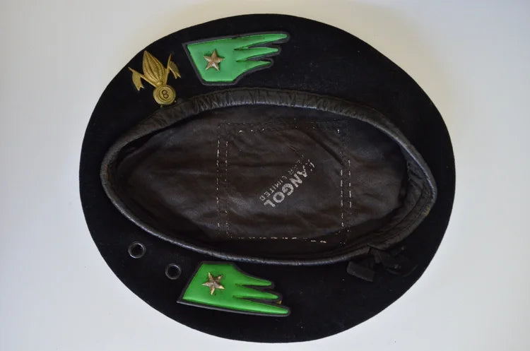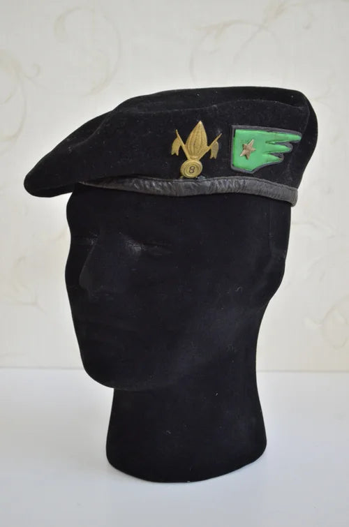 The beret features the brass insignia of the 8th Montebello Lancers, and the three-pointed green flames made of Vibram have been added (easily removable via rear pins).