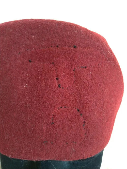 The absence of a visor, in accordance with Koranic law, allowed Muslims to rest their foreheads on the ground three times, facing Mecca, during the five daily prayers. The fez is uncovered, but traces of the original decorations (skull and eagle) remain clearly visible, as seen in the photos.