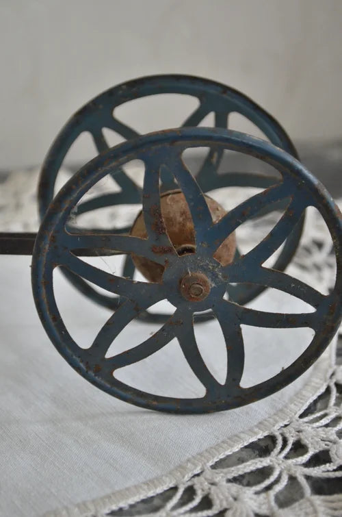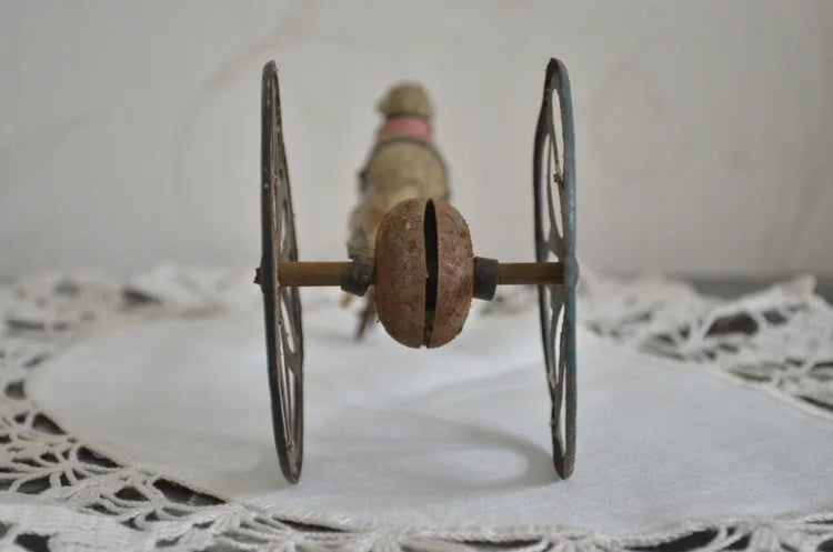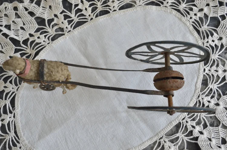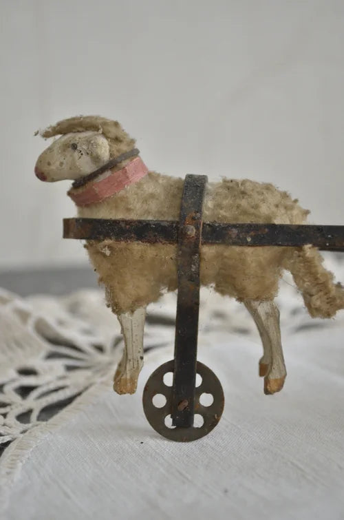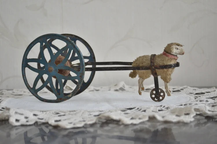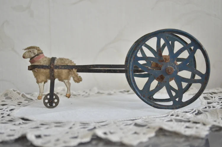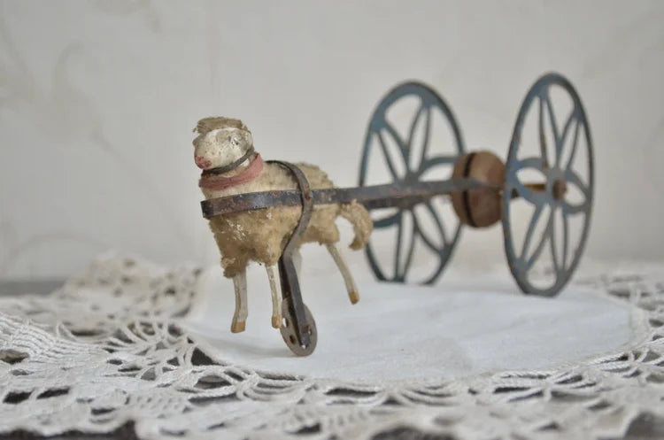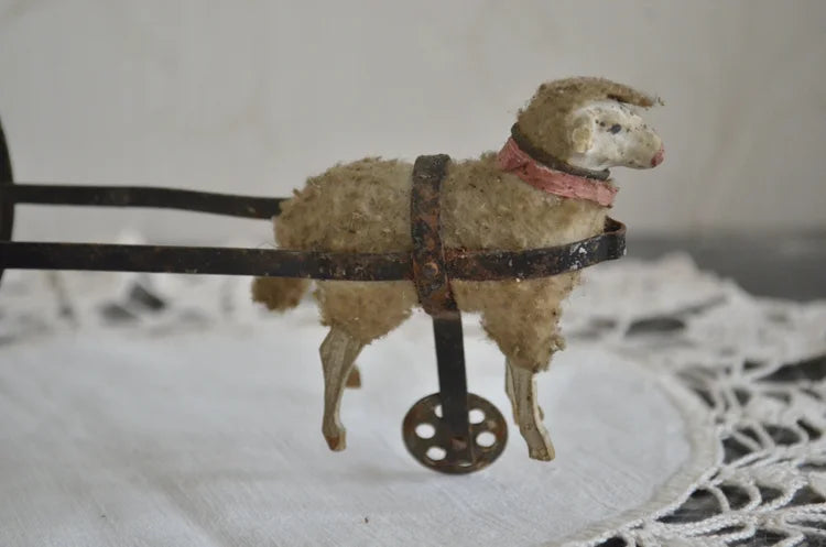 Si tratta di un carretto trainato da una pecora con campanellino, realizzato in metallo.