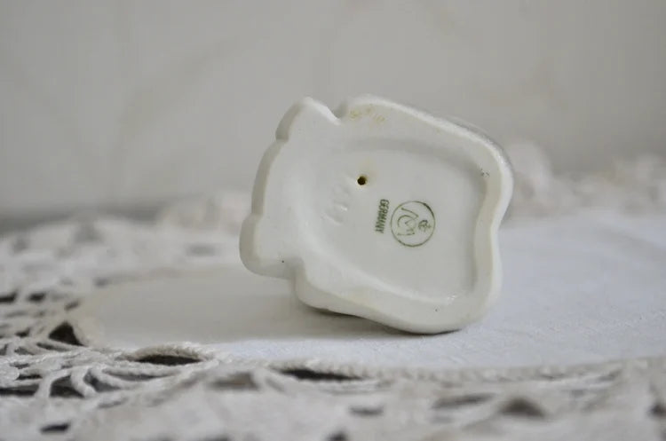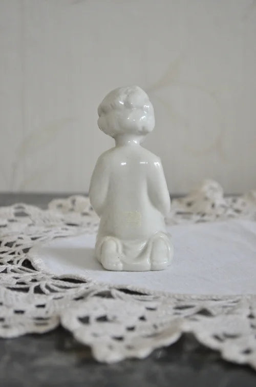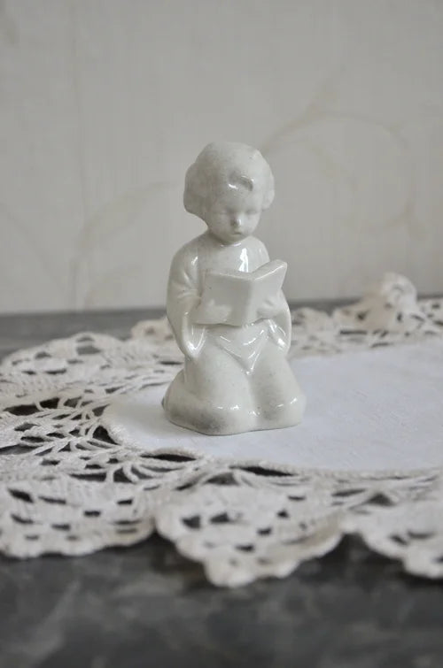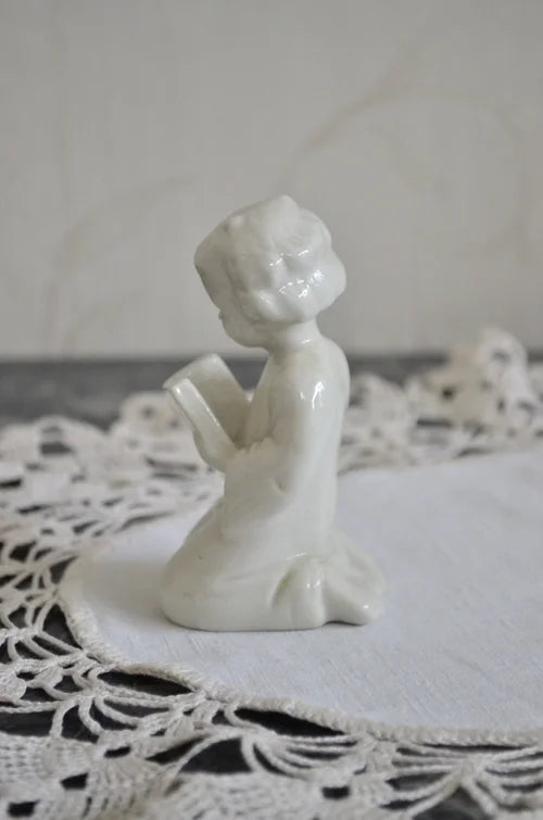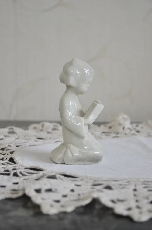 Bimbo che legge un libro, realizzato in ceramica, recante al fondo il marchio ‘‘ O M Made in Germany ’’ seguito da un codice impresso direttamente sulla ceramica.