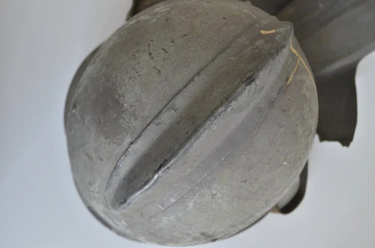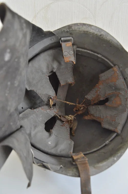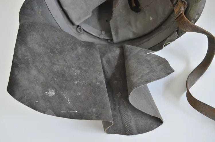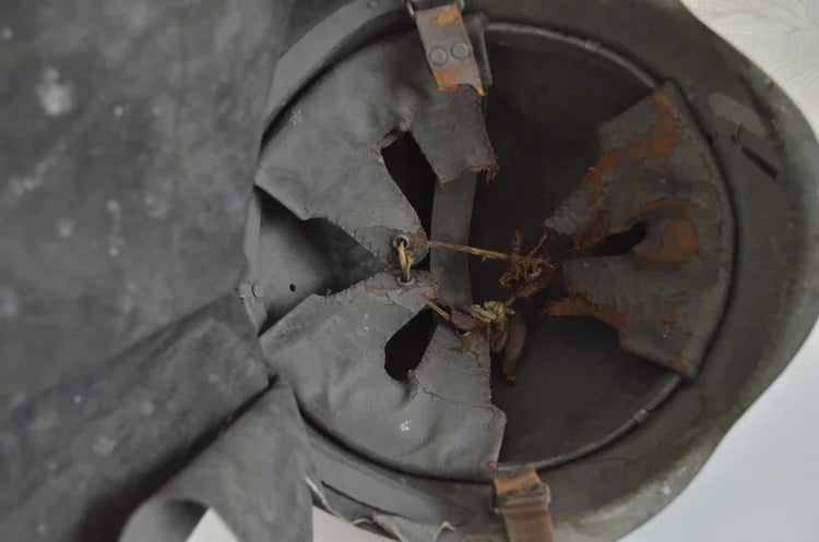 All’interno porta ancora le vecchia imbottitura tipo Wz.31 della Seconda Guerra Mondiale, oltre al sottogola (spezzato da una parte ma presente) e al paranuca in cuoio.