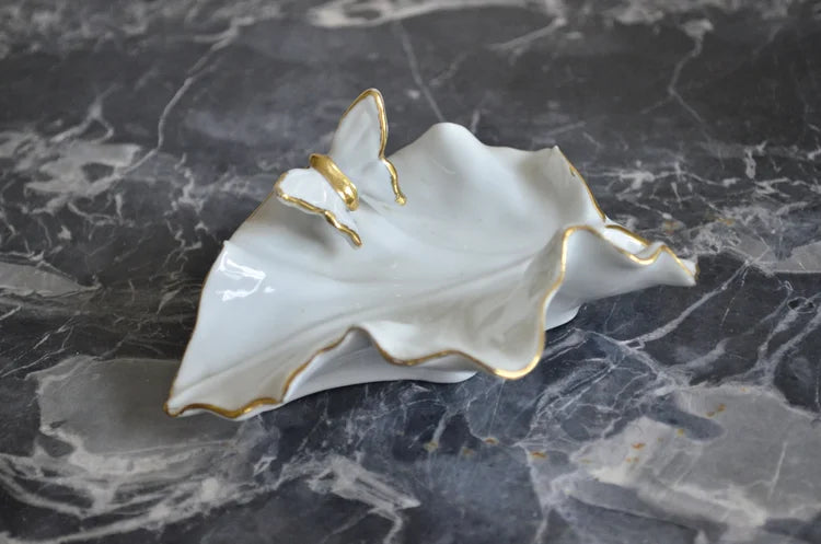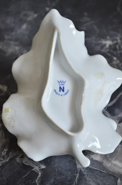 Delicata foglia decorativa in ceramica, con dettagli dorati, in ottime condizioni. Realizzato in pregiato impasto di Limoges.