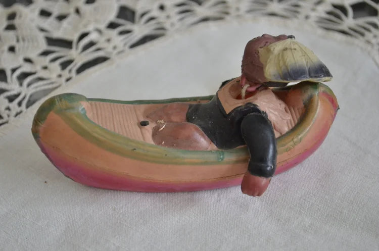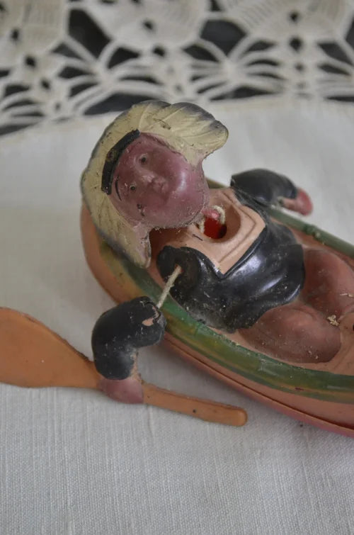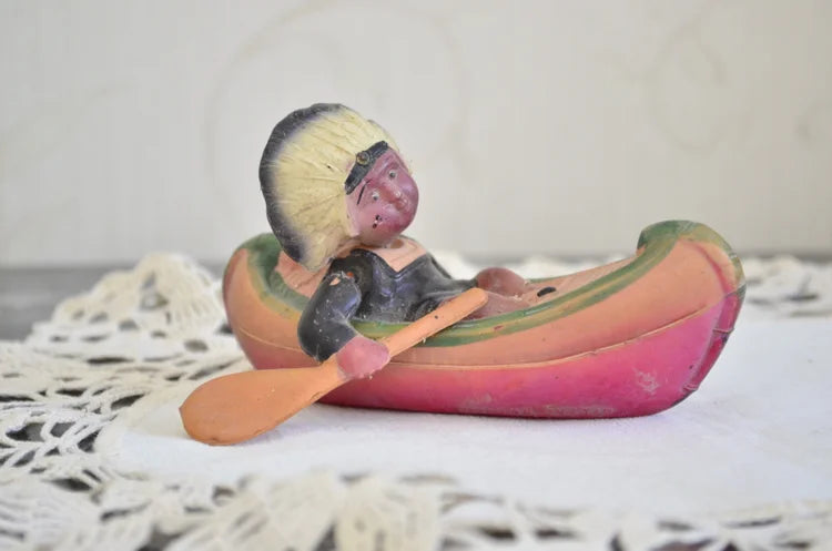 Si tratta di un indiano in canoa realizzato in Celluloide, prodotto nel Giappone Occupato quindi risalente al periodo 1945 - 1951.