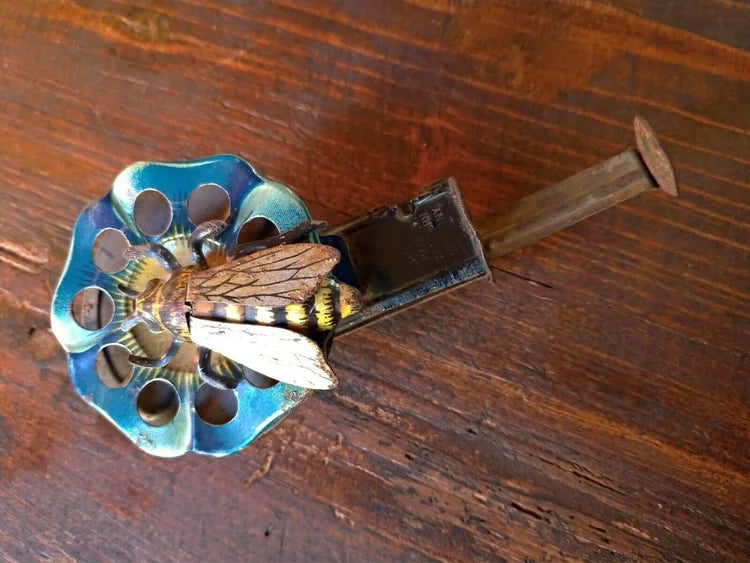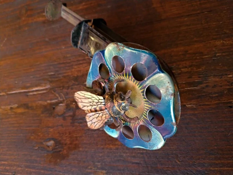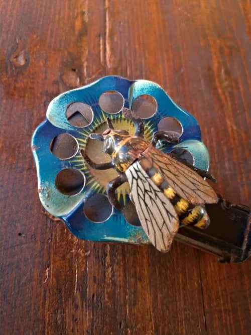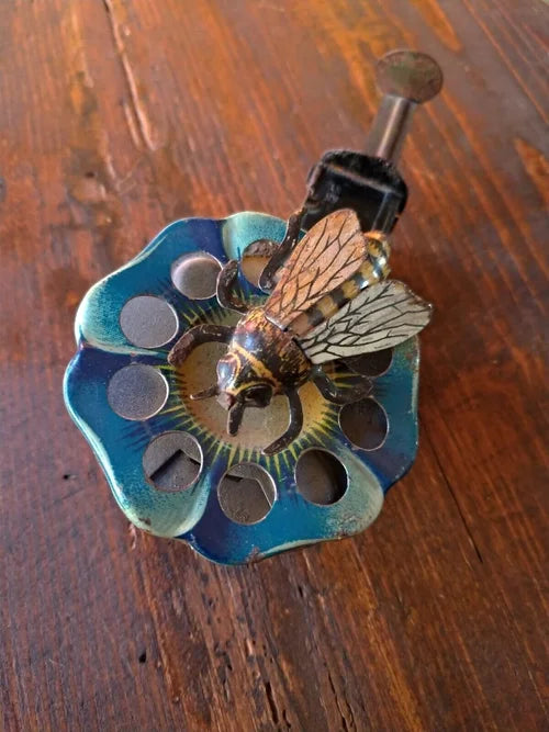 Un piccolo e raro giocattolo di tempi lontani: un fiore litografato realizzato in latta blu con petali in rilievo, con al centro un ape sempre realizzata in latta.