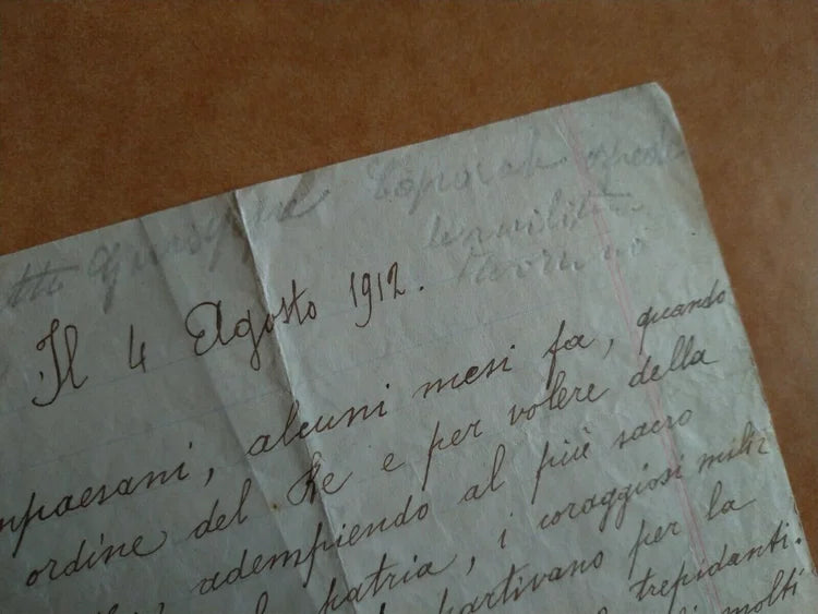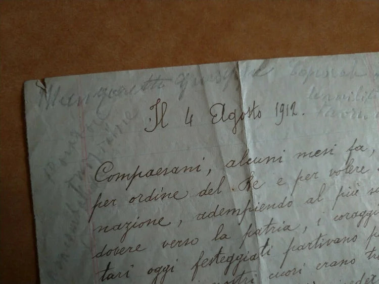 Interessante documento scritto a mano datato 4 agosto 1912, in pratica è la trascrizione del discorso di bentornato ai soldati del Regio Esercito Italiano di Quincinetto, al ritorno dalla Guerra Italo-turca del 1911 e 1912.
